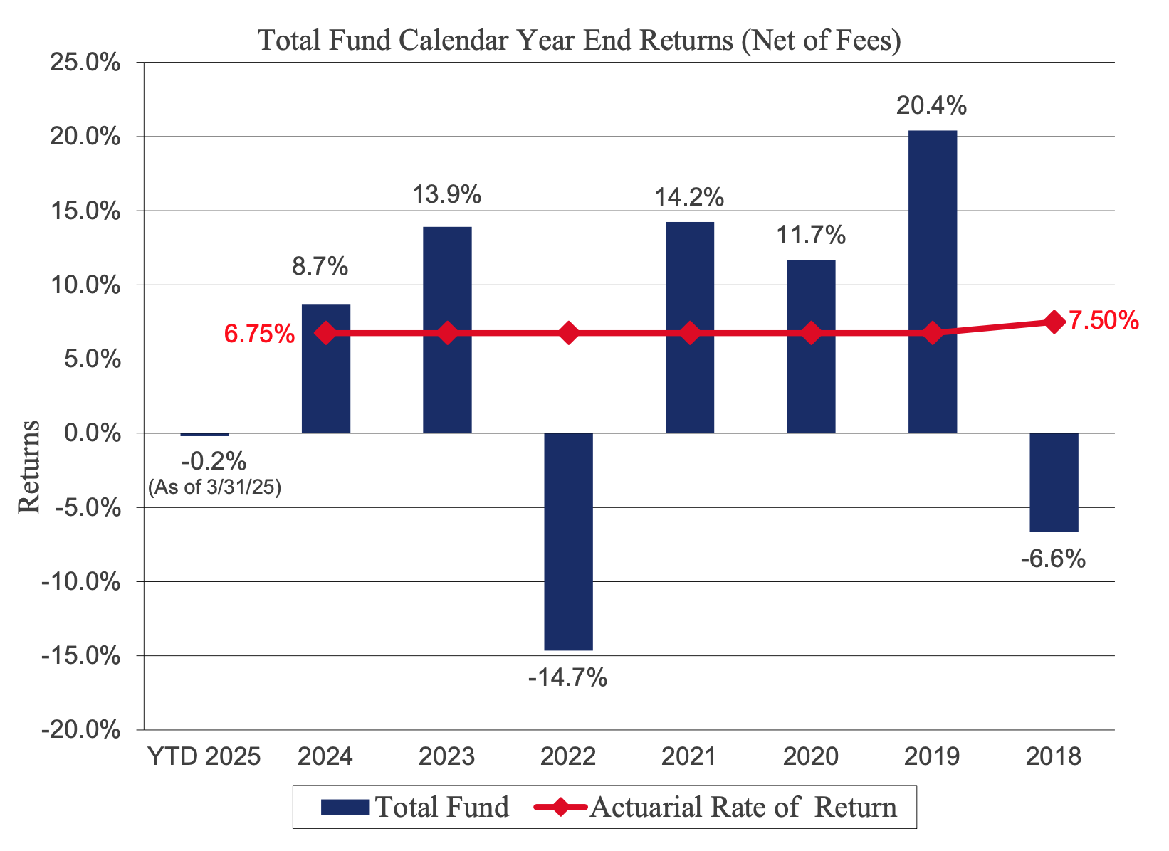 The Fund is built on the foundation of a long-term investment horizon, diversification of assets, and disciplined investment policy compliance. This foundation accounts for the ups and downs of financial markets. Tools such as asset smoothing, strategic asset allocation, and periodic portfolio rebalancing help the Fund maintain stability and meet long-term obligations. While short-term market movements can draw attention, they are not a reliable measure of the Fund’s overall health or trajectory.